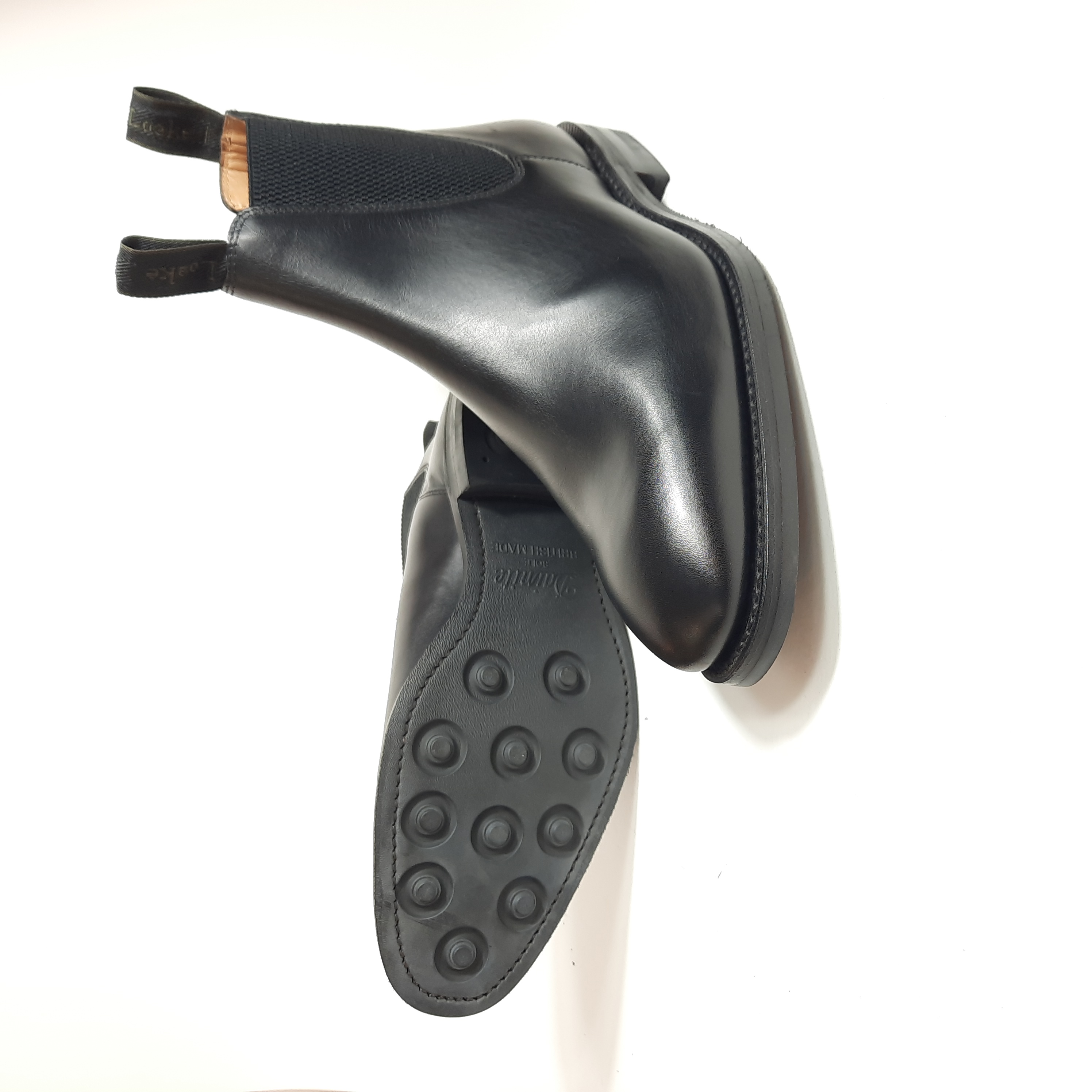 Deze Goodyear gemaakte Chatsworth van Loake 1880 is een klassieke Chelsea boot in Black Waxed Leather met een Dainite rubberen loopzool . Leest:Jockey op een G breedte.